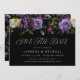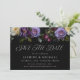Casamento floral elegante salve as datas que apresentam uma borda superior de flores roxas, marfim e burgundy com folhagem verde e bagas escuras. "Salvar a data" é exibido em tipografia elegante e moderna. Personalize o floral roxo salve as datas com seus nomes, data e local do casamento e site do casamento. A design coordena-se com a nossa coleção de casamentos Moody Gothic Floral.