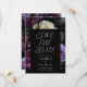 Casamento floral elegante salve as datas com um fundo de flores roxas, marfim e burgundy com uma folhagem verde e exuberante sobre fundo preto. "Salvar a data" é exibido em tipografia elegante e moderna. Personalize o floral roxo salve as datas com seus nomes, data do casamento e local. A design coordena-se com a nossa coleção de casamentos Moody Gothic Floral.