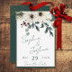 Esta rústica salva a design do cartão de casamento apresenta um buquê superior de pinheiro, bagas vermelhas, flores brancas e eucalipto com um borrão de ouro falso. O fundo é branco, com uma estrutura verde-escura e fina e bronca. Esta design faz parte da Rustic Berries Winter Floral Wedding Suite de cartas criadas pela Simplesmente Farmhouse Press.