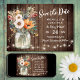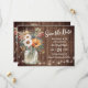 Esse casamento rústico Salve a Data apresenta um arranjo de flores silvestres bonito em um pote de mason com uma simples fita de luzes de cordas contra um fundo de madeira.