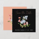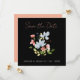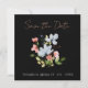 Casamento Floral Simples de Boho Preto e Rosa Salve as Cartões de Data - Design Botânico Elegante com Tipografia de Script Rosa. Anuncie seu casamento em estilo com nossos cartões modernos de guardar a data mostrando uma mistura cativante de flores azuis e cor-de-rosa, complementada por um verde-luxuoso sobre um fundo preto impressionante. O elegante design botânico é acentuado pelo uso da tipografia de roteiro rosa, acrescentando um toque de romance e sofisticação. Com uma estética minimalista, esses cartões únicos de salvamento da data balanceiam perfeitamente a modernidade e a beleza natural. Capture a essência do seu dia especial com esta fantástica combinação de tipografia de script azul, rosa, verde e elegante, definindo o palco para uma celebração inesquecível.