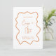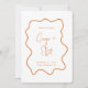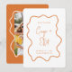 Um design de convite de casamento moderno e tendência para salvar a data com uma laranja queimada ousada e uma moldura ondulada desenhada à mão na frente em torno do seu texto personalizado e nomes e em torno da sua foto no verso do cartão. Todas as cores deste design podem ser alteradas na ferramenta de design.
