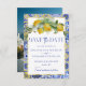 Design de inspiração mediterrânica com azulejos italianos, azuis e amarelos, ao estilo da costa, com limões pintados a aquarelas e falso quadro arquivado de brilho dourado.