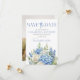 Design de casamento floral elegante com arranjos florais pintados a aquarelas de flores azuis de hydrangea, verde e rosas brancas.