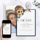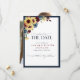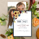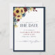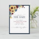 Crie o casamento perfeito Salve o cartão de Data com este design bonito e moderno, com um girassol de cor d'água, motif floral de azul marinho e burgundy, e tipografia de script com letra de mão. A parte traseira da placa apresenta sua foto favorita do noivado. Entre em contato com o designer para produtos correspondentes. Copyright Elegant Invites, todos os direitos reservados.