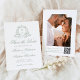 Anuncie seu grande dia com este casamento de fotos verdes com na moda, salve o cartão de data. A frente exibe as iniciais do monograma do casal rodeadas por uma crista botânica em verde-sábio, com "Salvar a Data" escrito elegantemente em caligrafia correspondente em fundo branco. Personalize com seus nomes, data do casamento e local do casamento. A parte traseira apresenta sua foto vertical do noivado junto com um código de QR digitalizável, fazer fácil para os convidados acessar o site do seu casamento. Com espaço para instruções personalizadas, este design combina encantos e simplicidade — perfeito para jardins, outdoor e casamentos inspirados na natureza.