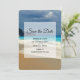 Salve o cartão de ponto com uma bela fotografia que apresenta um mar azul turquesa e uma praia arenosa com montanhas no fundo.