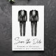 Anúncio de "Save the Date" para casamento gay com dois tuxedos em aquarela e uma apresentação elegante. Adicione os seus dados e personalize o verso.