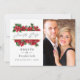 Cartão de casamento de Natal rústico e moderno com moldura geométrica dourada e tipografia manuscrita com sinos de trenó, flores de poinsettia, azevinho, visco e pinheiro.