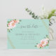 Aqui está uma maneira moderna e na moda de anunciar sua data de casamento. Se você está apaixonado pelo tema elegante do casamento verde da menta e você também ama ouro e florais, aqui está seu jogo perfeito. Este design apresenta peonias cor-de-rosa e cor-de-pêssego suave e botões de rosa, juntamente com uma forma geométrica falsa de folha de ouro rodeando os detalhes de Salvar a Data. Tudo isso num fundo de verde-menta. Todo texto é facilmente personalizado usando os campos modelo fornecidos. A parte traseira da placa pode adicionar uma foto ou qualquer informação adicional que você queira. Veja a coleção que acompanha os produtos complementares do pacote de casamento. Esta é uma excelente escolha para casamentos de Primavera e Verão. Se você tiver uma pergunta sobre design ou quiser ver este design em outro produto, por favor, sinta-se à vontade para entrar em contato comigo em jschmidtdesignworks@gmail.com. Design © Judith Schmidt.