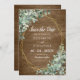 Buquês de aquarela eucalipto verde decoram a estrutura geométrica dourada neste casamento rústico de madeira salve o cartão de data, com o texto em modernas fontes elegantes, e fundo de madeira rústica.
