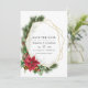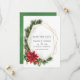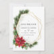 Convite de casamento magnético de Natal rústico e moderno com moldura geométrica dourada e tipografia manuscrita com sinos de trenó, flores de poinsettia, azevinho, visco e pinheiro.