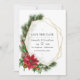 Convite de casamento de Natal rústico e moderno para salvar a data com moldura geométrica dourada e tipografia manuscrita com sinos de trenó, flores de poinsettia, azevinho, visco e pinheiro.