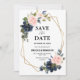 Casamentos geométricos florais azuis marinhos escuros, salvo o cartão de data com buquê elegante de azul marinho, azul real, branco, rosa de pincel e folhas verdes de eucalipto sábio e elegante quadro neutro geométrico de brilho. Entre em contato comigo para obter ajuda sobre a personalização ou se você precisar de outro produto com este design.