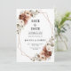 Cartão de salvar a data de casamento com tema floral terroso laranja terracota elegante, apresentando um buquê elegante de rosas e peônias nas cores branca, bege, sage e terracota, além de folhas de eucalipto. Por favor, entre em contato para obter ajuda na personalização ou se precisar de qualquer outro produto com este design.