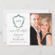 Cartões de save the date de casamento monogramados com crista de folhas e tipografia de caligrafia elegante personalizáveis com as iniciais do casal.
