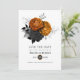 Convite de casamento com tema de Halloween gótico floral laranja e preto vintage personalizável para os seus detalhes. Caso seus nomes pareçam um pouco desalinhados quando inseridos, "Clique para personalizar ainda mais" (o link azul na parte inferior de "Personalize este modelo") para ajustar facilmente na área de design.