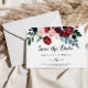 Este casamento floral, cor-de-rosa, cor-de-rosa, salvo a data é perfeita para um casamento rústico. O design apresenta cor-de-água rosa, pincel, marinho, colheres azuis e burgundy, rosas com folhagem verde que se juntam perfeitamente em buquês elegantes.