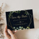 Este casamento horizontal verde-azul-de-ouro geométrico, exceto a data é perfeito para um casamento moderno. A design apresenta lindas folhas verdes pintadas manualmente em um fundo azul escuro, enfeitando uma armação geométrica dourada.