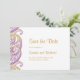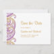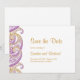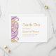 Cartão de salvar a data do casamento indiano com desenhos paisley roxos e dourados. Perfeito para casamentos tradicionais e outros eventos.