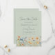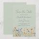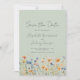 Este design boho rústico apresenta uma borda de aquarela de flores silvestres laranja e azul na parte inferior. As palavras "Salve a Data" e os nomes do casal aparecem em elegante escrita à mão em cinza carvão, com o texto restante em fonte sans serif em um fundo verde salvia.