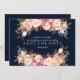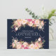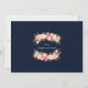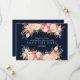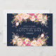 Design de cartão único e elegante, com rosas e peões pintados cor-de-rosa, pincelados em um fundo azul de marinho rico (você pode alterá-lo, mas precisa mudar a cor do texto para ajustado a cor de fundo escolhida). Na parte de trás, o mesmo design floral com a noiva e o nome do noivo. Use a ferramenta Personalizar para adicionar suas informações, alterar fontes, cores. Visite, por favor, minha Coleção Floral de Blush Moderno, para ver os itens correspondentes.