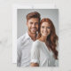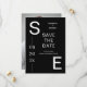 Este casamento de fotos simples e moderno minimalista Salve o cartão de Data mostra fundo preto com caligrafia branca moderna e iniciais, monograma. No verso você pode personalizar esta tendência Salve a data com sua própria foto.