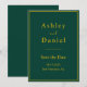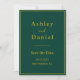 Este elegante casamento verde e dourado, salvar a data é perfeito para um casamento moderno. o simples design apresenta uma elegante caligrafia dourada num fundo verde.