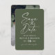 Um Simples Casamento Verde De Cor Verde Escura Monstera Salva As Cartões De Data. Este design moderno, porém clássico, é minimalista e elegante com uma simples cor sólida e um belo texto de assinatura de caligrafia. Mostrada na estrada verde da floresta de Caça Escura de Monstera. Também apresenta uma fotografia personalizada opcional do casal no verso. Ou simplesmente ocultar a camada para ter um fundo sólido. Para ver mais, procure as coleções de casamento de 2022 da Chic Paperie para ver todas as tendências de designs e cores de casamento para este ano.