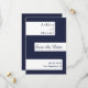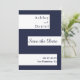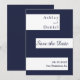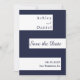 Este elegante casamento azul e branco com marinho salvo o cartão de data é perfeito para um casamento moderno. o simples design apresenta uma caligrafia azul elegante em listras brancas sobre um fundo azul marinho.