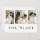 Casamento moderno Salve a placa de data apresentando um simples design preto e branco com uma fonte de sans serif minimalista junto com uma colagem de fotos apresentando suas três fotos favoritas. Use a modelo para adicionar sua mensagem personalizada ao verso. Esses Cartões salve a data quic e na moda com um design mínimo permitem que suas fotos sejam o principal foco.