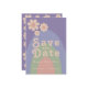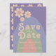 Convite de casamento em cores pastéis groovy com arco de margarida retrô moderno para salvar a data. Padrão de margarida minimalista retrô legal com design de arco-íris em rosa pêssego, verde, azul e lilás lavanda roxo. Este cartão de hipster divertido para salvar a data é fácil de personalizar usando os modelos simples. Ideal para definir o tom para um casamento de verão, primavera ou outono. Arte original da artista Catherine Sweetman