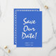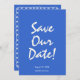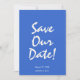 Este casamento moderno e retrô minimalista Salve a Modelo de Data é excelente para você. Se você estiver procurando um Modelo de Data de Casamento bonito, elegante e fácil de personalizar. Um modelo muito elegante e único. Que apresenta um fundo azul brilhante arrojado com tipografia escrita à mão branca leitosa. E a armação de corações desenhados à mão. Pegue este casamento de na moda, salve a data e faça seus convites realmente comprometidos.