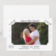 Design apresenta a foto que você fornece como design principal. Os cantos da foto são cortados para se parecer com uma imagem antiga à sua volta. Texto totalmente personalizável permite que você diga exatamente o que você quer anunciar seu grande dia! O monograma do casal é exibido ao lado da imagem de uma cruz e dentro de anéis de casamento unidos. Formato tradicional para um cartão "Salvar a Data", o design inclui cabeçalho, data, nomes de noiva e noivo e cidade/estado da cerimônia. Projetado para coordenar com a "Suíte de Casamento Monograma Católico Tradicional".