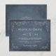 Um elegante cartão de 'salve a data' com um fundo de quadro-negro azul-ardósia empoeirado emoldurado por uma delicada videira e uma borda de cacho de uvas — ideal para casamentos em vinhedos, vinhas ou regiões vinícolas. A tipografia mista refinada em branco-prateado suave completa o visual sofisticado. Todos os nomes, datas, locais e detalhes do site são totalmente personalizáveis.
