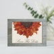 Um casamento outono salva a data que apresenta uma imagem em frente a um girassol de laranja a partir do topo do retângulo enquadrado pela imagem de madeira de casca rija. Personalize o texto na frente e atrás. Procure por convites correspondentes na Paperie da Jill. com