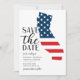 Salvar a data do casamento no destino Califórnia com uma ilustração do estado e a bandeira dos EUA.