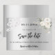 Um moderno e elegante Salve a Data para um casamento. Um fundo falso, de aspecto prateado, decorado com rosas brancas, flores e rendas brancas. Personalize e adicione uma data e seus nomes. O texto: Salvar a Data é gravado com um script de estilo com letra de tendência grande.