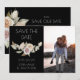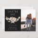 Esses cartões de salvar a data apresentam um design botânico moderno e tendência com rosas e folhas cor-de-rosa empoeiradas, pêssego e bege em aquarela com folhagem em fundo preto. Personalize-os com seu próprio texto e foto. Produtos correspondentes disponíveis.