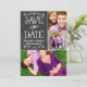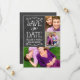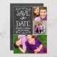Convites de anúncio de colagem de fotos de dois lados caprichosos e únicos economizam datas com uma aparência texturizada rústica fundo de quadro negro com fontes de estilo manuscrito que têm uma aparência de giz branco. Personalize com os detalhes do casamento e três (3) fotos de noivado favoritas.