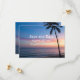 Uma cena de pôr do sol de uma praia impressionante com um céu ouro e roxo, ondas de oceano calmas, e uma silhueta negra de uma palmeira à direita. As matizes quentes refletem sobre a água, criando uma atmosfera romântica e serena — perfeita para um convite de casamento.