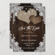 Casamento russo salve cartões de data com corações de burlap em um fundo de madeira decorado com rendas florais brancas e luzes de cordas.