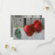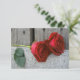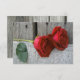 Um casamento salva a data com uma foto de duas rosas vermelhas sobre um fundo de madeira. Personalize o texto do lado oposto.