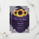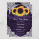 Casamento elegante de púrpura rústica e girassol salva os cartões de data com flores de girassol em um fundo de madeira rústica adornado com rendas florais brancas e luzes de cordas. Itens correspondentes disponíveis.