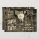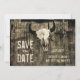 Crânio de vaca do boi russo ocidental com chifres, estilo vintage, salvar o cartão plano do anúncio da data. Textura ranhosa. O vaqueiro de madeira de celeiro inspirou-se. Fotografia de Marg Seregelyi, direitos autorais da imagem.