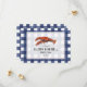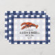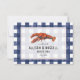 Um casamento náutico rústico salva a data com a ilustração de uma lagosta sobre um design de gingham azul-curado com texto preto na frente.