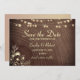 Anuncie seu dia especial com este encantador rusticado Salve a Data, com textura de grãos de madeira, luzes brilhantes de cordas e sotaques florais elegantes de ouro. Com um olhar acolhedor e romântico, esta carta define o tom perfeito para outono ou casamentos no inverno, recepções de celeiro ou celebrações de feto.