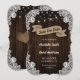 Casamento de campo rústico personalizado salve o cartão de data com fita colada contra um fundo de madeira rústica adornado com luzes de cordas e rendas florais brancas.
