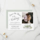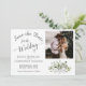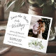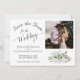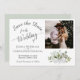 Este belo casamento Salve o Cartão de Data apresenta um design bócio rústico com caligrafia de escrita falsa e um aglomerado de folhas de cor d'água pintadas manualmente, eucalipto e verde-água em tons de menta, musgo e sábio verdes. Há espaço para sua foto, o nome do casal e a localização do casamento. Elegante, na moda e chic, este cartão é uma forma excelente de deixar seus amigos e família saberem salvar a data do seu dia especial.