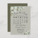 Este belo cartão de encontro vai avisar seus amigos e família sobre seu próximo casamento. Apresenta um elegante design de bolos com um calendário personalizável do mês do seu casamento com um coração à volta do dia especial, rodeado por folhas de eucalipto e verde num sábio ou num fundo verde-oliva claro. Há espaço para seus nomes, a data do casamento e a localização. A parte de trás apresenta um buquê de folhagem rústico, amarrado com uma fita branca e um arco.